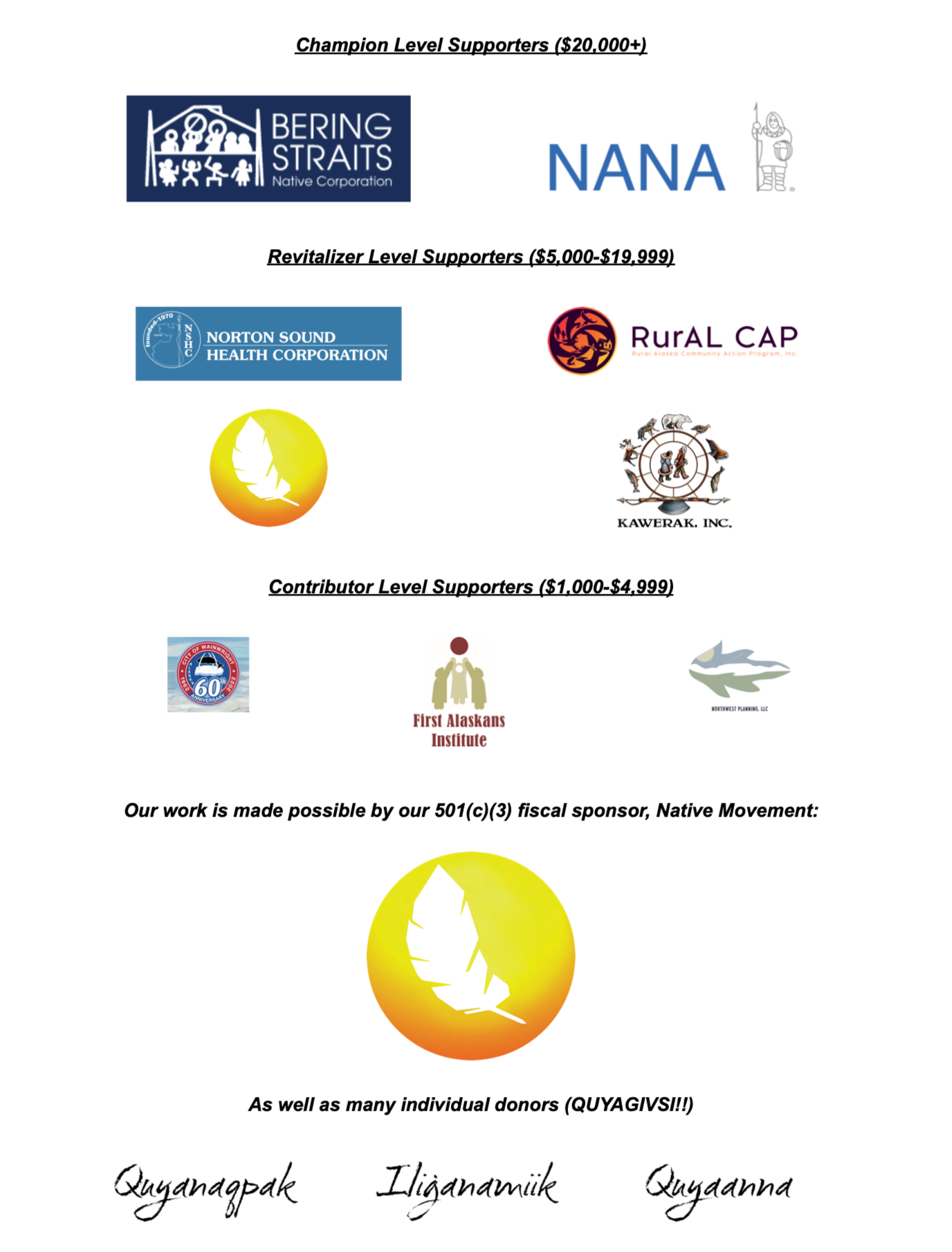 To Kawerak, our host in Siqnazuaq. In-kind staff and organizational support from Kawerak and Katirvik Cultural Center are making the 2025 Intensive happen.
